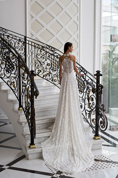 فستان الزفاف الذي حلمت به في صغرك تحول إلى حقيقة, فستان من الدانتيل مع نقشة مميزة على الظهر تلفت الأنظار.